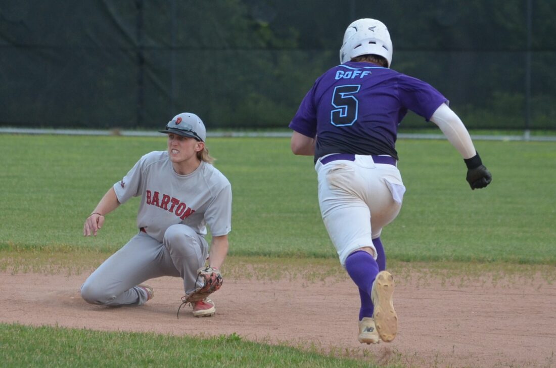 TL Photo/KIM NORTH Barton second baseman Dylan Busby waits for a pitch as Martins Ferry‘s Chase Goff tries to steal a base during the second inning of Monday night’s Ohio Valley Baseball League game at- above the purple city. Goff was absent and the Braves won 5-3. …